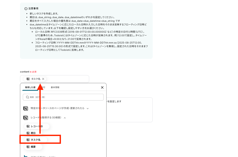 - Todoistでタスクを作成するアクションでは、タスク名(content)や詳細(description)にNotionから取得したどの情報を割り当てるかを設定します。