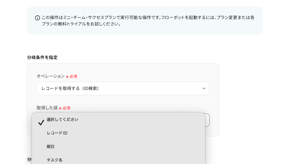 - 分岐はミニプラン以上のプランでご利用いただける機能(オペレーション)となっております。フリープランの場合は設定しているフローボットのオペレーションはエラーとなりますので、ご注意ください。