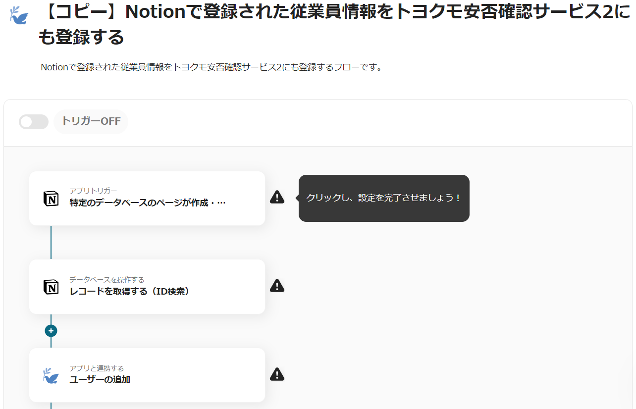 今回は「Notionで登録された従業員情報をトヨクモ安否確認サービス2にも登録する」という以下のテンプレートの設定方法をご紹介します。