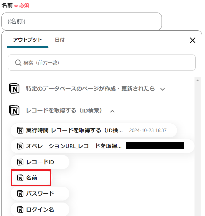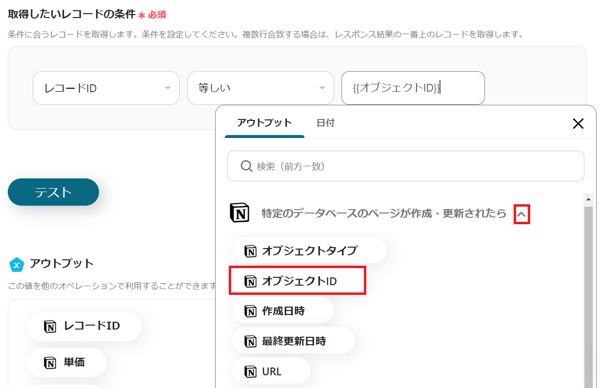 「レコードを取得する(ID検索)」のアウトプットを使用して設定します。