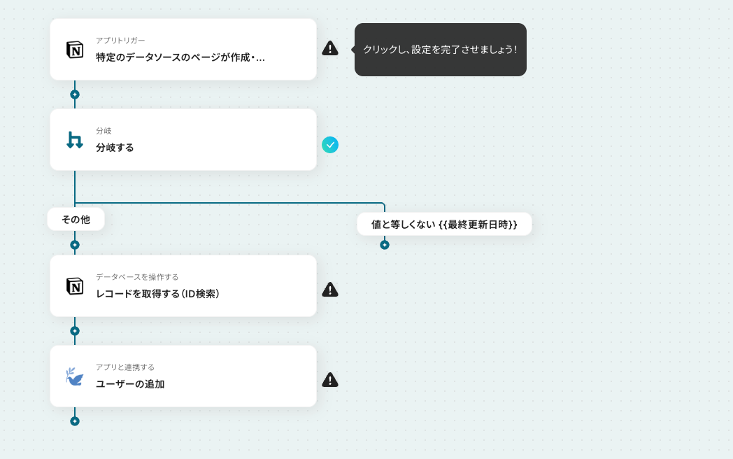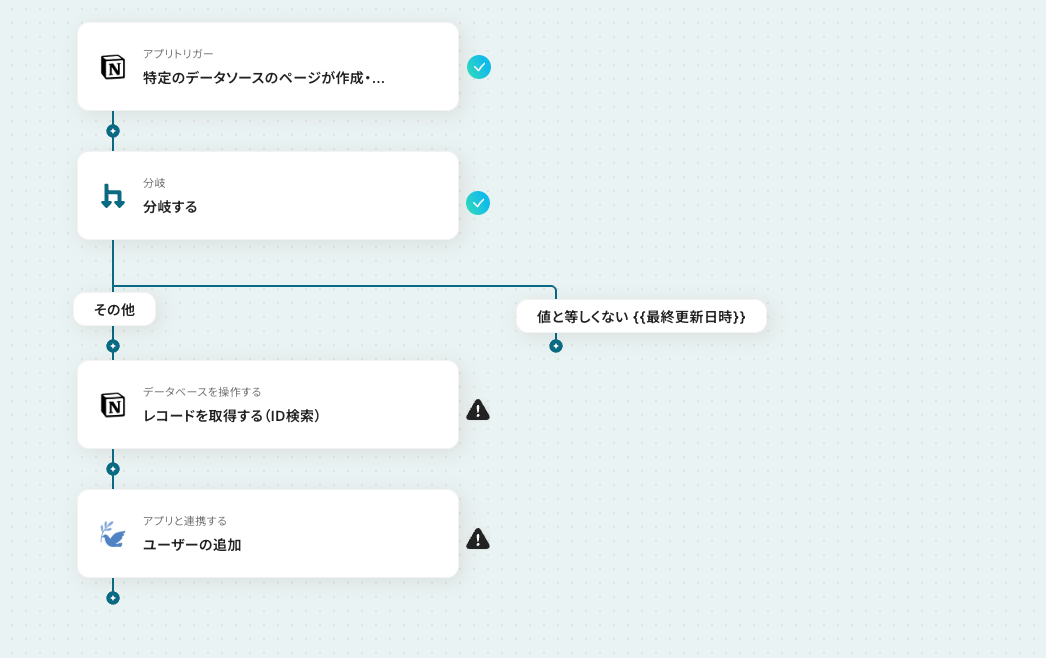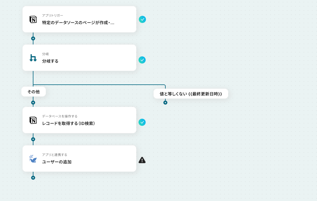 はじめに、Notionとトヨクモ安否確認サービス2をYoomと連携します。 次に、トリガーでNotionを選択し、「特定のデータソースのページが作成・更新されたら」というアクションを設定します。 次に、オペレーションで分岐機能を設定し、新規ページの場合のみ後続のアクションが実行されるようにします。 続いて、オペレーションでNotionの「レコードを取得する(ID検索)」アクションを設定し、トリガーで検知したページの情報を取得します。 最後に、オペレーションでトヨクモ安否確認サービス2の「ユーザーの追加」アクションを設定し、取得した従業員情報を登録します。 ※「トリガー」:フロー起動のきっかけとなるアクション、「オペレーション」:トリガー起動後、フロー内で処理を行うアクション■このワークフローのカスタムポイント