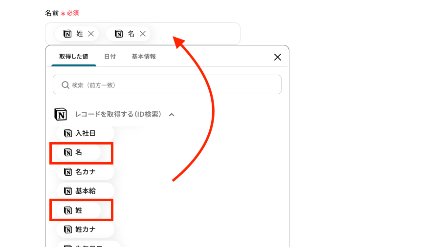 以下の画面が表示されるので、必須項目の設定をしましょう。 「レコードを取得する(ID検索)」の取得値を使用して設定します。