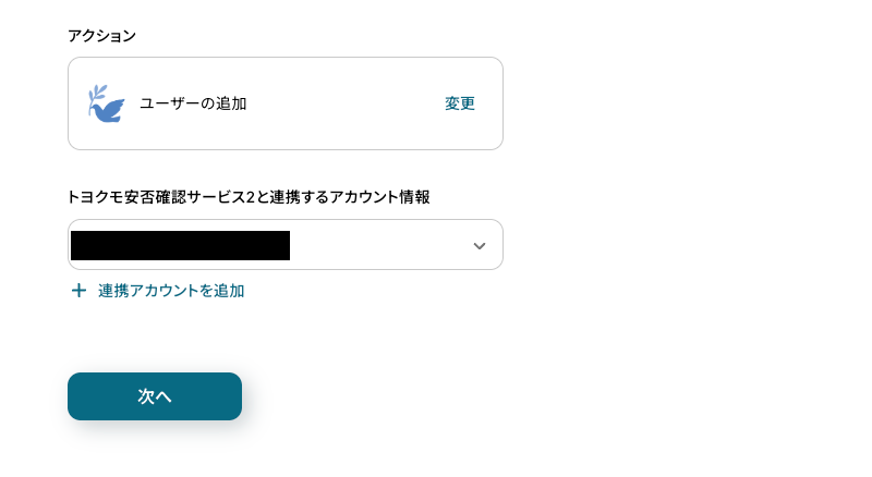 「トヨクモ安否確認サービス2と連携するアカウント情報」→正しいか確認