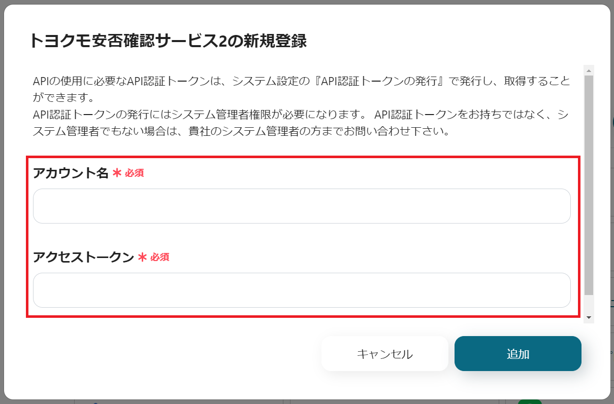 次に、トヨクモ安否確認サービス2のマイアプリ登録をしてください。 先ほどと同じようにトヨクモ安否確認サービス2を選択しましょう。 以下の画面が表示されたら、「アカウント名」と「アクセストークン」の設定をします。