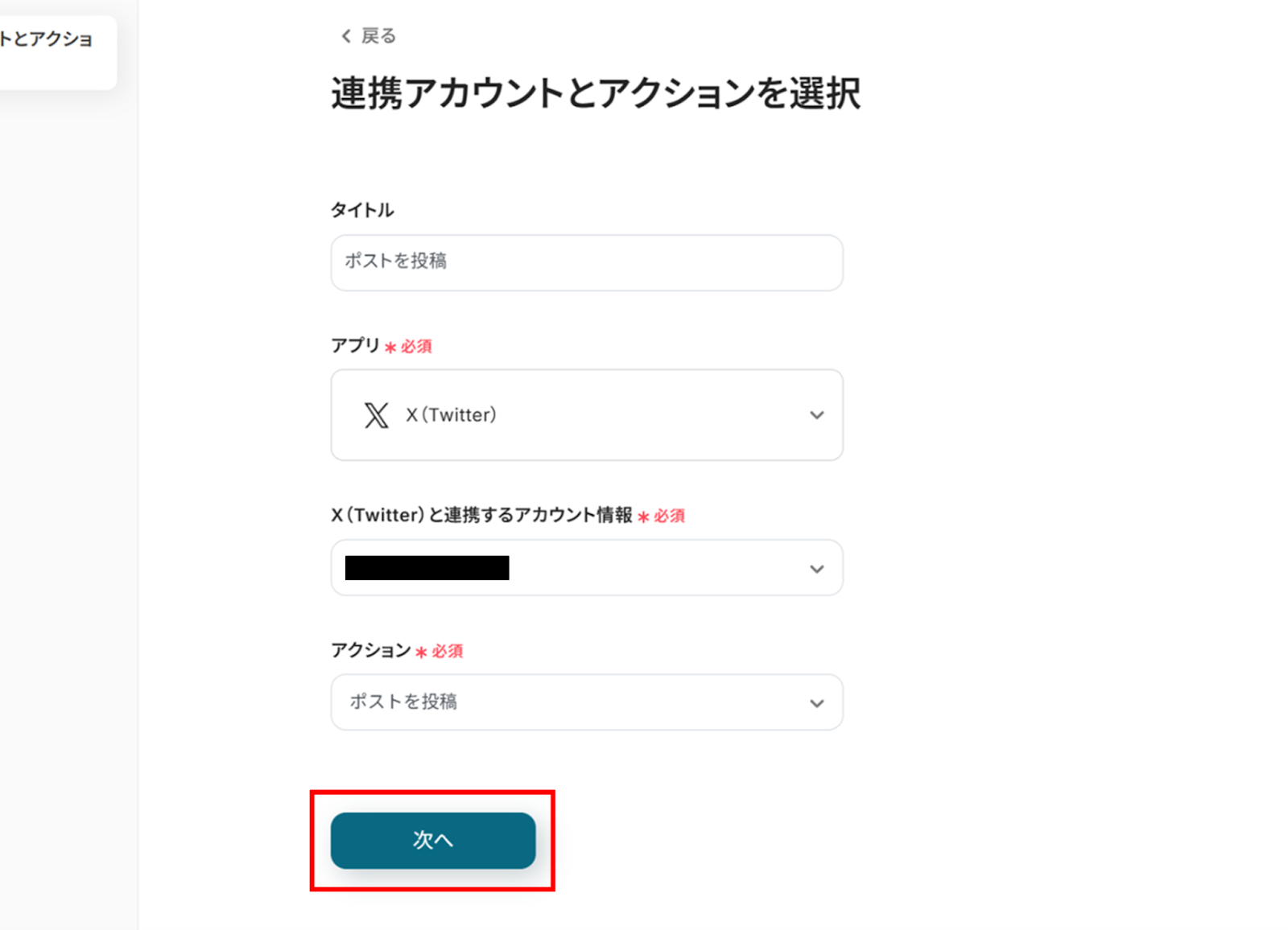 (2)X(Twitter)の「連携アカウントとアクションを選択」画面から、X(Twitter)と連携するアカウント情報に誤りがないかを確認し、アクションは「ポストを投稿」のままで「次へ」をクリックします。