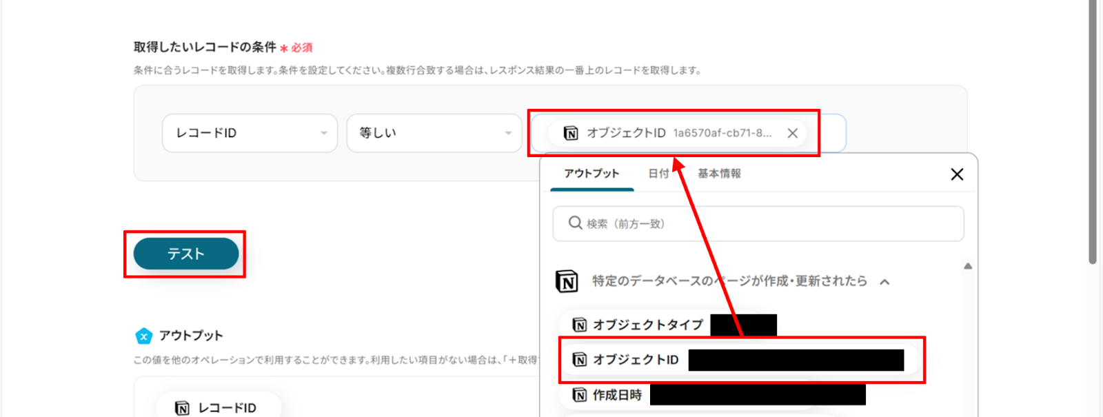 (3)「データベース操作の詳細設定」画面から、取得したいレコードの条件をプルダウンとアウトプットを使って入力します。