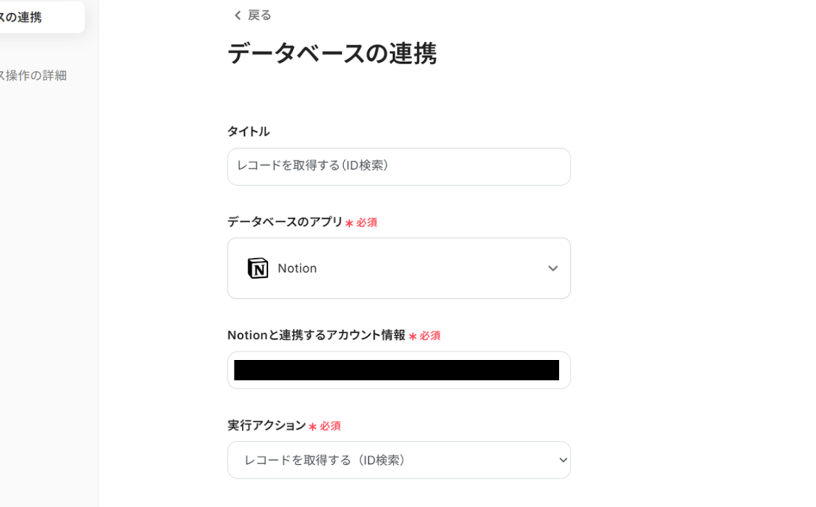 (2)Notionの「データベースの連携」画面から、Notionと連携するアカウント情報に誤りがないかを確認し、実行アクションは「レコードを取得する(ID検索)」のままにします。
