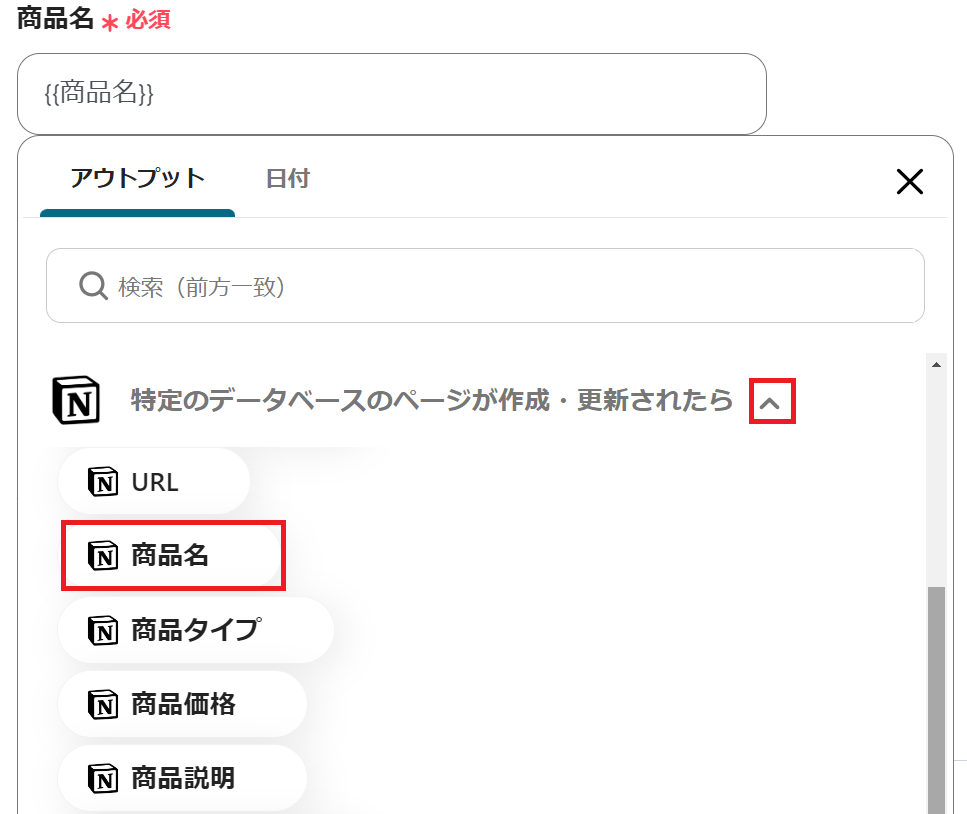 スクロールして、Notionのアウトプットを利用して「商品名」を設定してください。