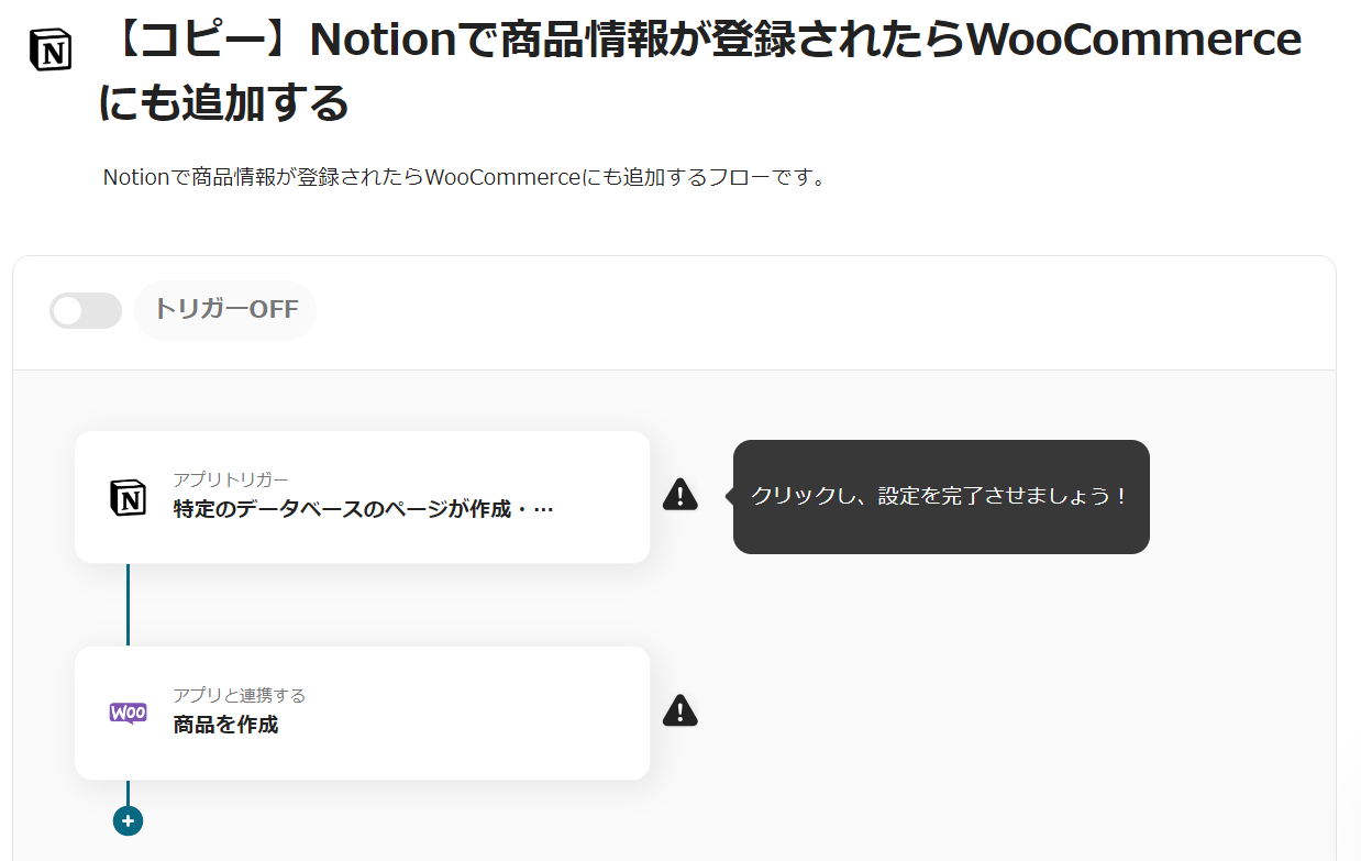 今回は「Notionで商品情報が登録されたらWooCommerceにも追加する」という以下のテンプレートの設定方法をご紹介します。