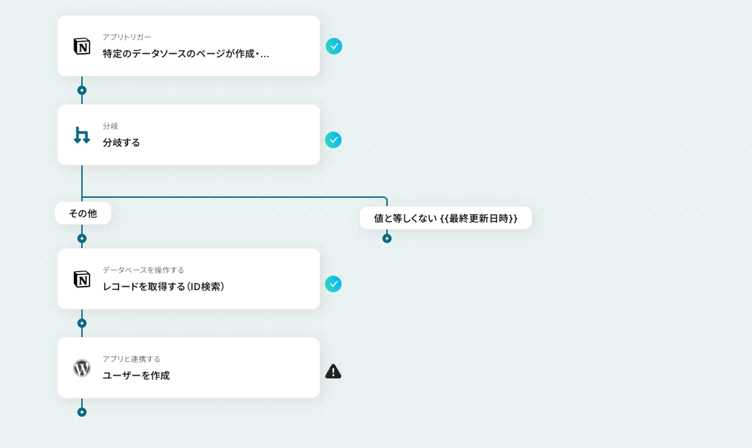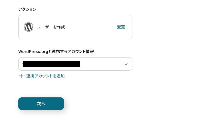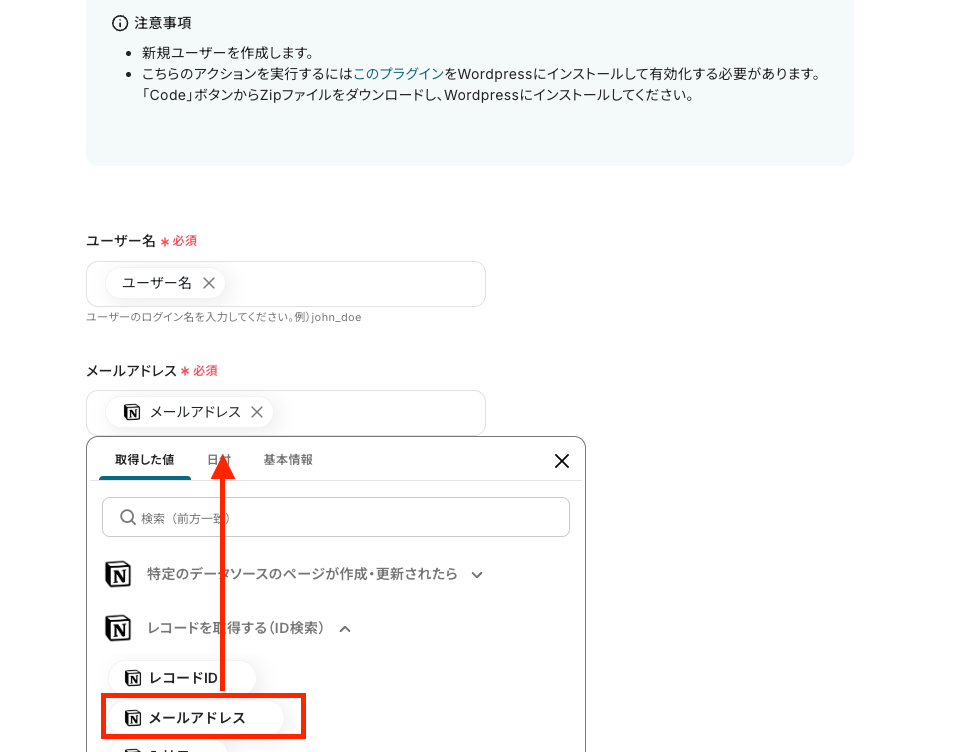 - 最後に、オペレーションで WordPress.orgの「ユーザーを作成」アクションを設定し、Notionから取得した情報をもとにユーザーを作成します