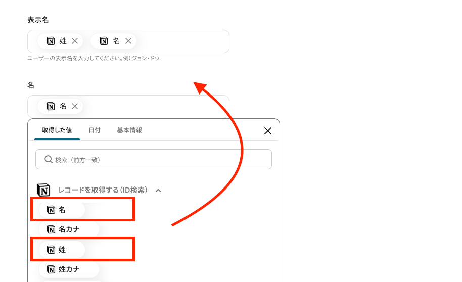 先述の3つの必須項目に『取得した値』を追加していきます。