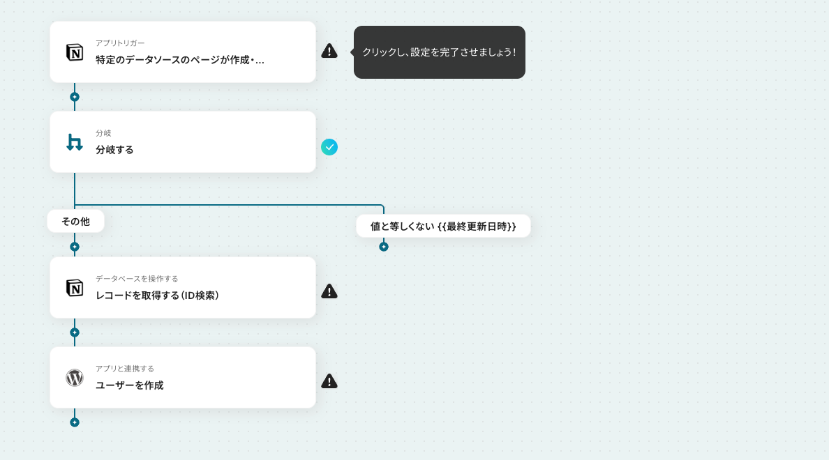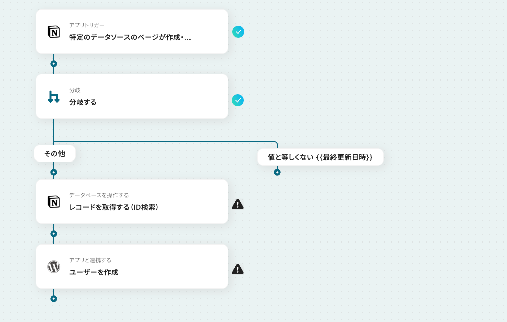 ステップ4:Notion「レコードを取得する」、WordPress.org「ユーザーを作成」のアクションを設定