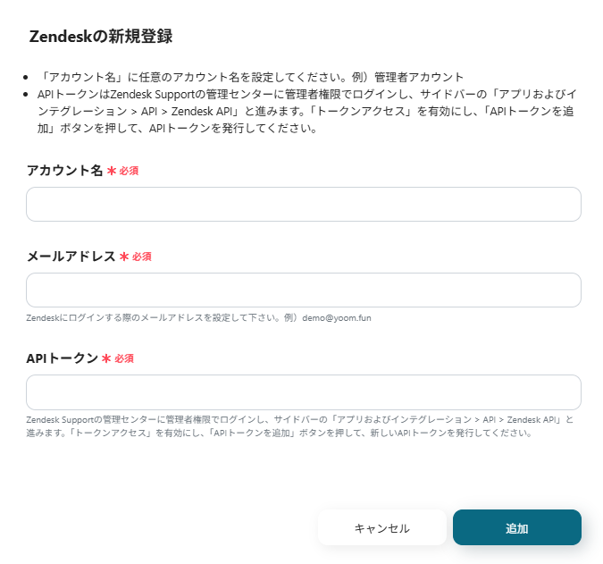 「アカウント名」「メールアドレス」「APIトークン」を入力し、「追加」をクリックします。
