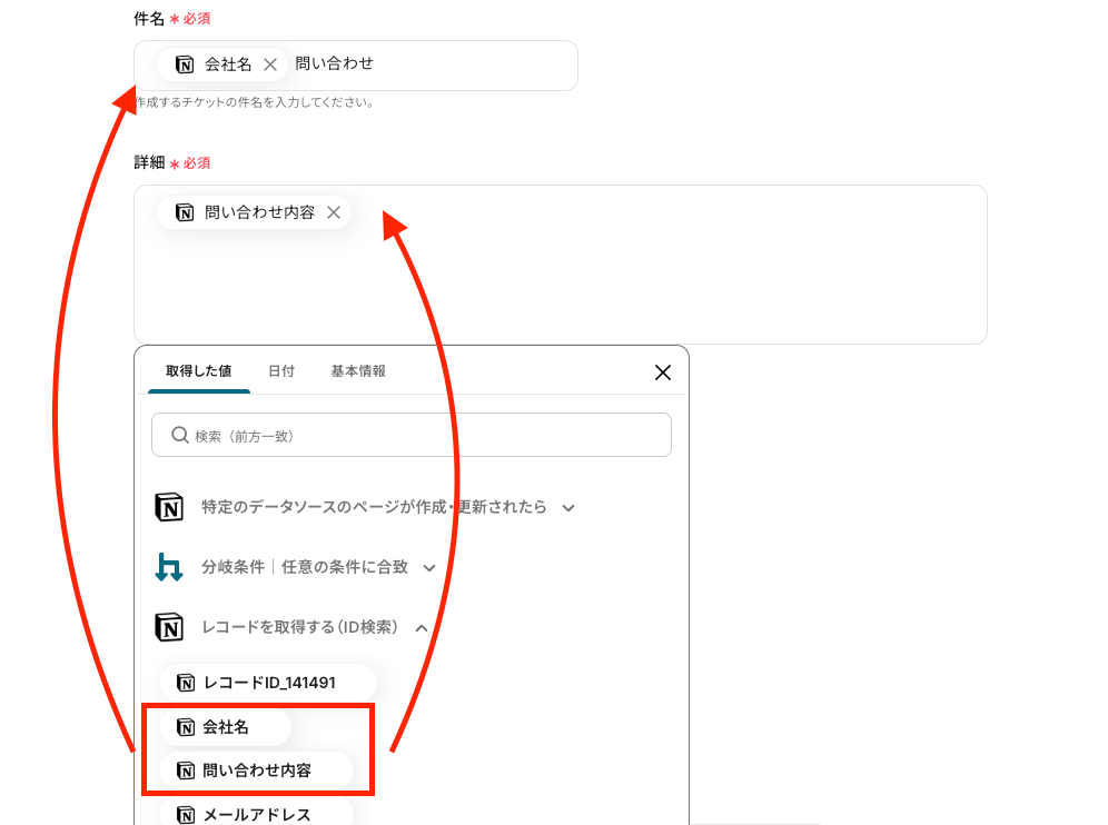 「件名」や「詳細」は『取得した値』から、情報を入力できます。