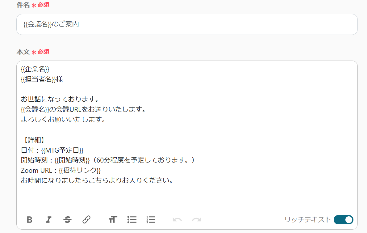 また、あらかじめ設定したテンプレートに基づいて処理が進むため、どのリードにも一貫して会議作成が行われます。