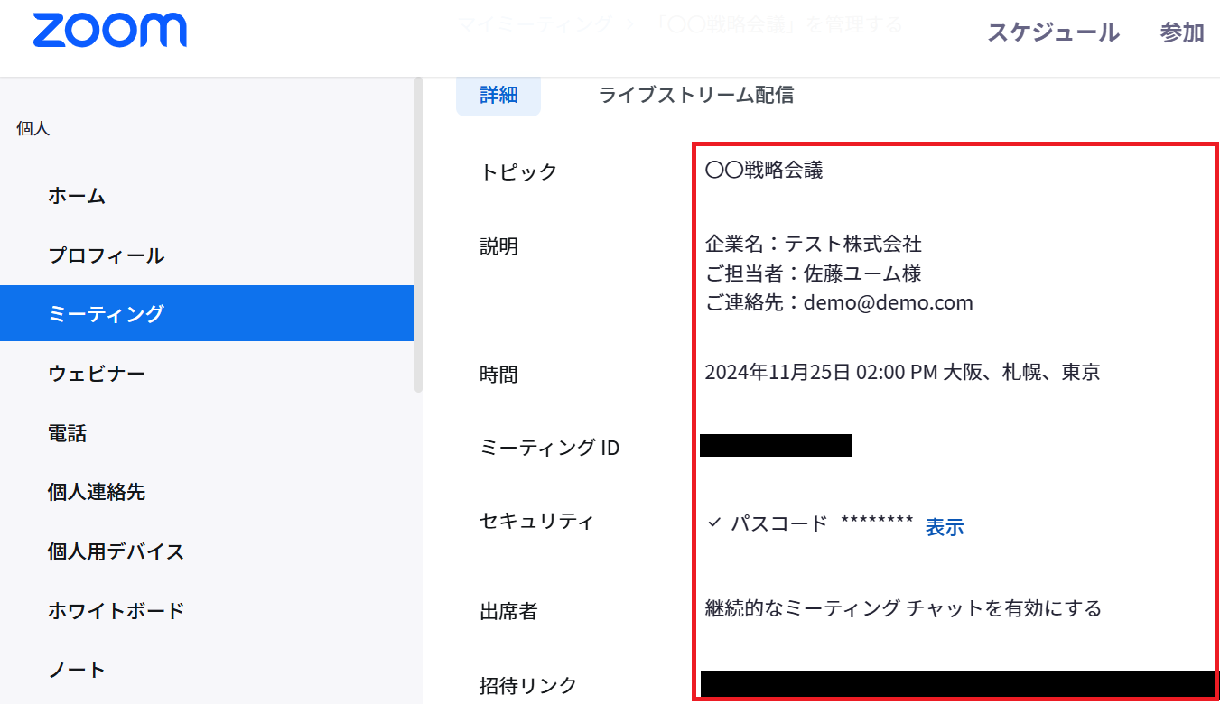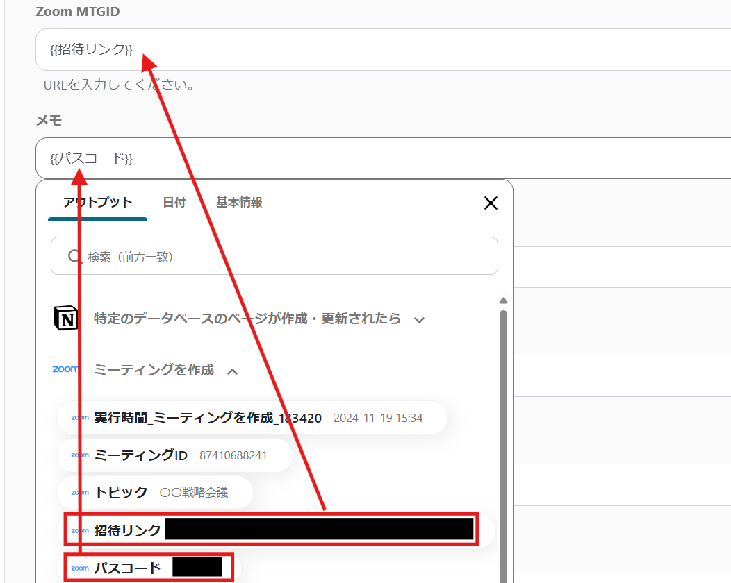 今回はZoomのMTGURLとパスコードを入力するように設定します。