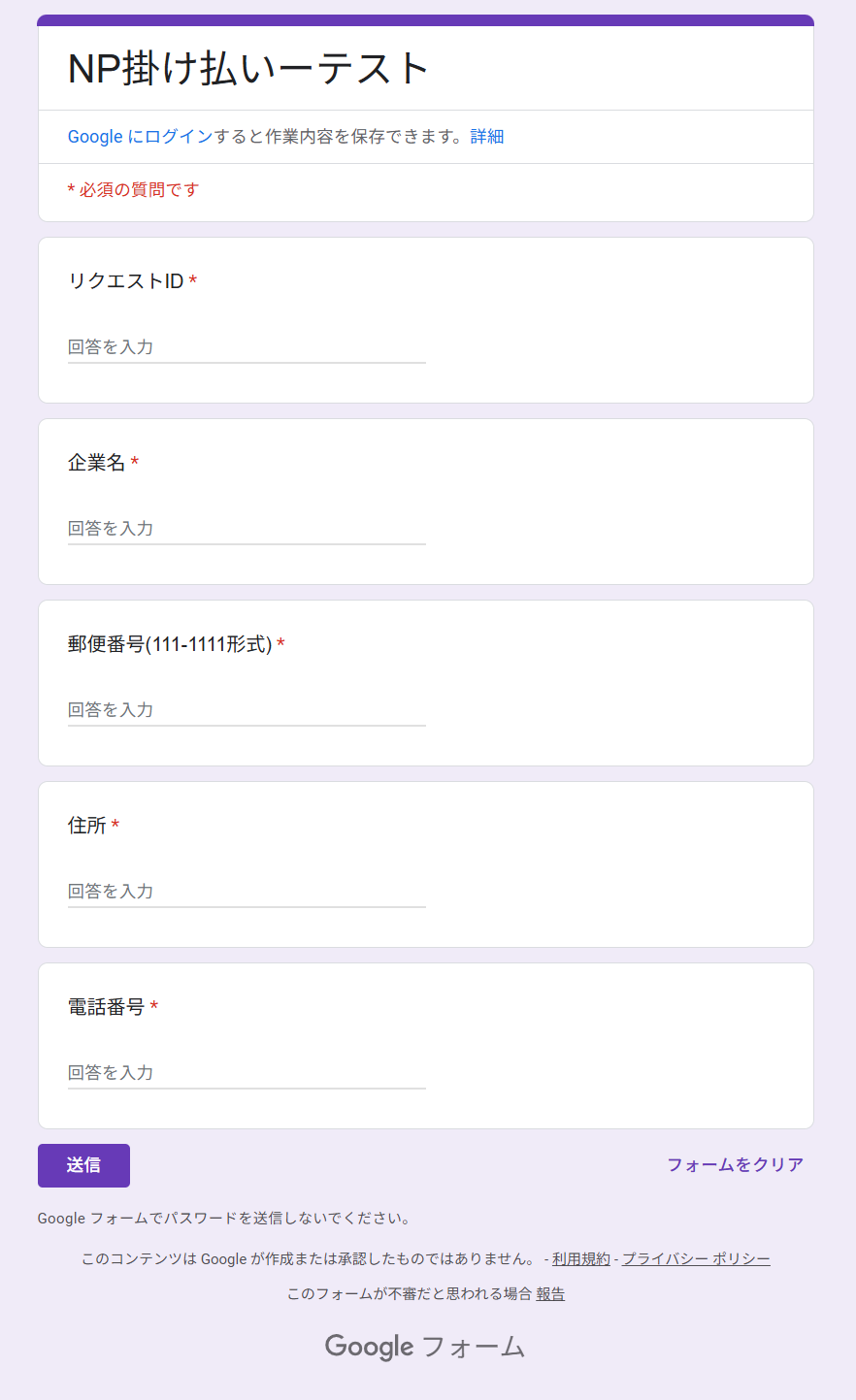 今回は、テスト用に以下のフォームを作成しました。