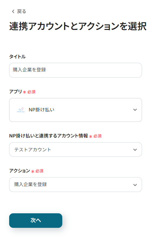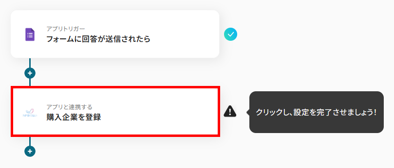 NP掛け払いの購入企業を登録するアクションをフローの中に組み込むことで、フォームツールなどから受け取った顧客情報を自動でNP掛け払いに登録できます。