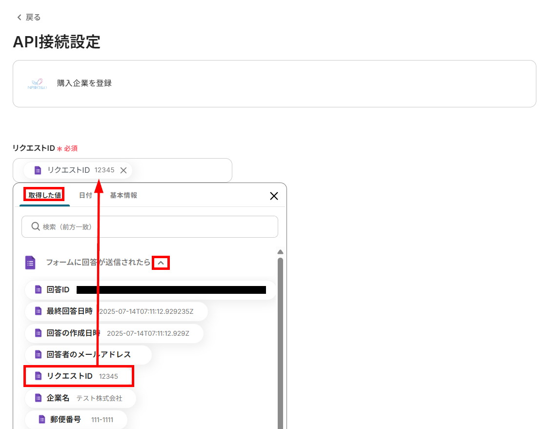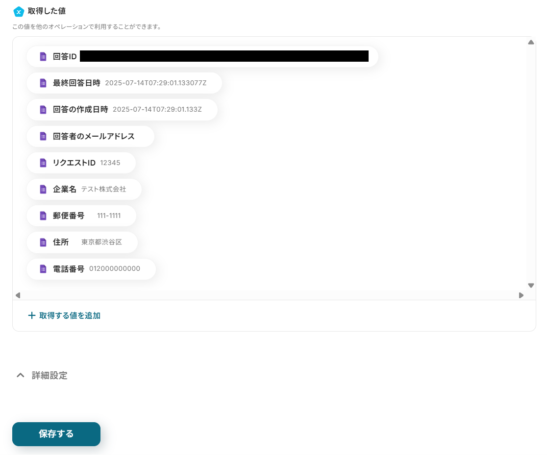 テストが成功したら、「取得する値の追加」から、NP掛け払いに登録する情報を設定します。