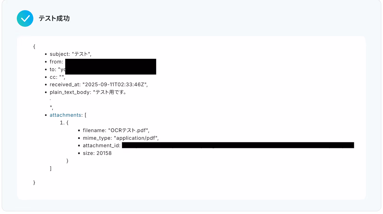 以下の画像の取得した値から添付ファイルのデータを利用し、この後のステップでOCR機能を用いて文字の読み取りを行います。