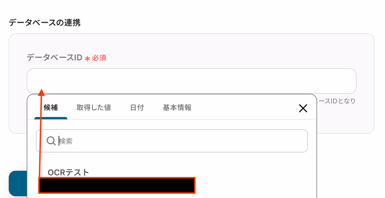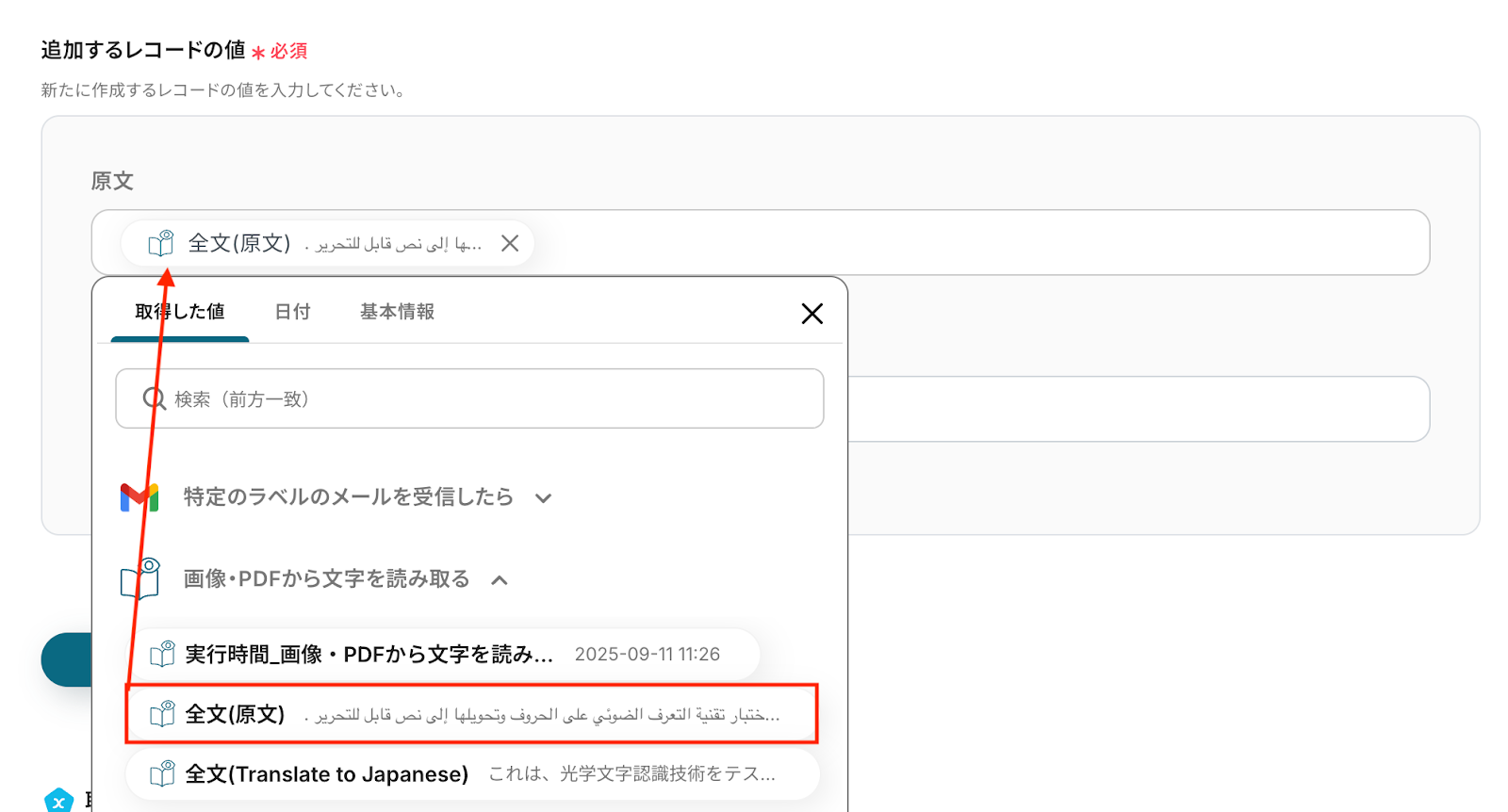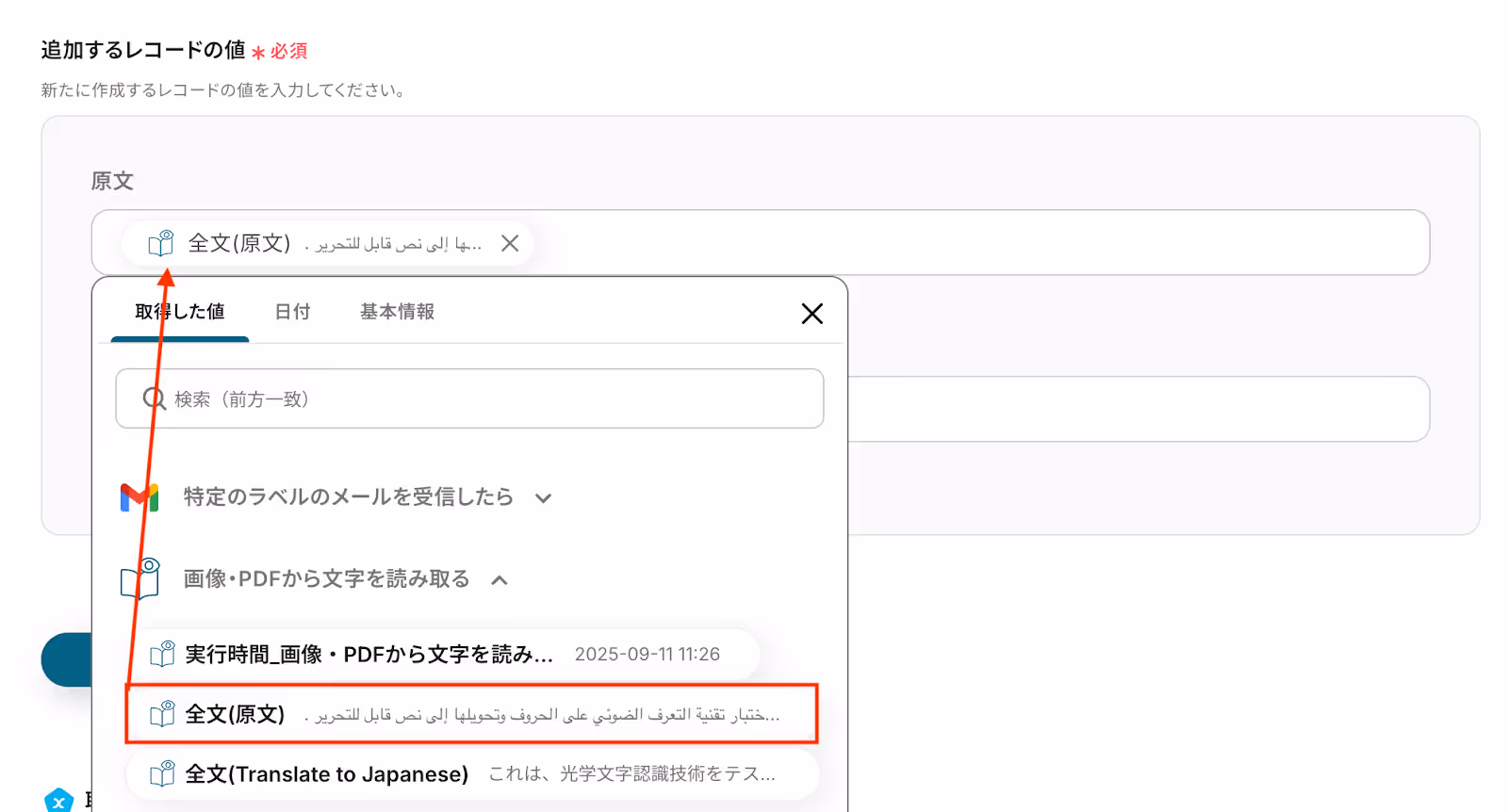 入力欄をクリックすると前のステップ(OCR機能で文字の読み取り)で取得した値が表示されるので、その中から対応する項目を各フィールドに割り当てましょう。