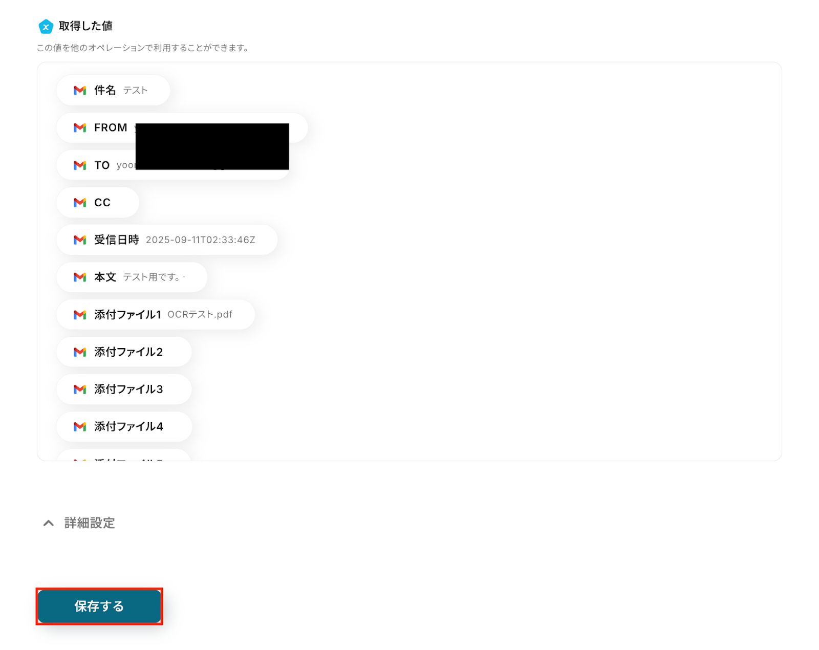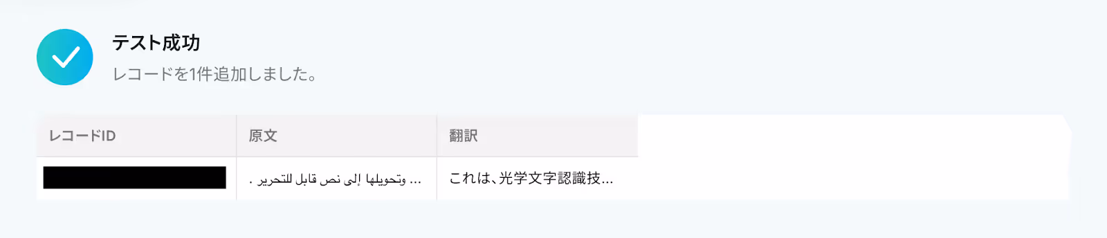 テストに成功すると、AIによって添付ファイルから読み取り・翻訳された情報が一覧で表示されます。