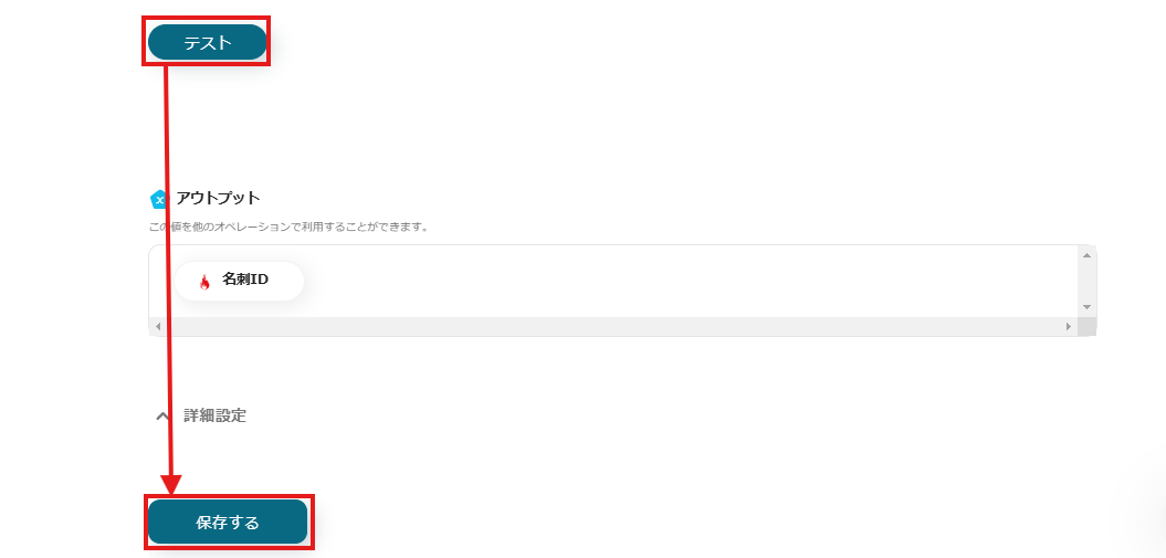 ファイルの添付方法は、上記画面の通り「取得した値を使用」「名刺」を選択します。