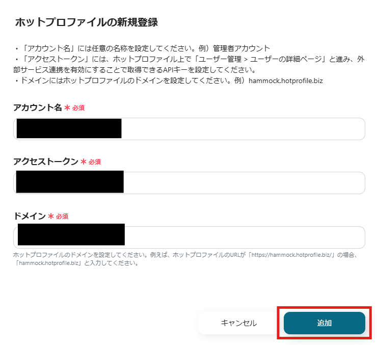 上記画面の注釈を参考に、アカウント名・アクセストークン・ドメインを入力し「追加」をクリックしてください。