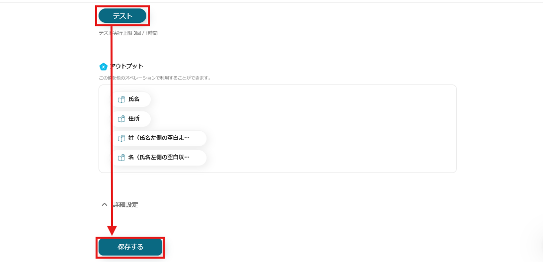 設定が完了したら、「テスト」をクリックしアウトプットが正しく取得できているか確認してください。