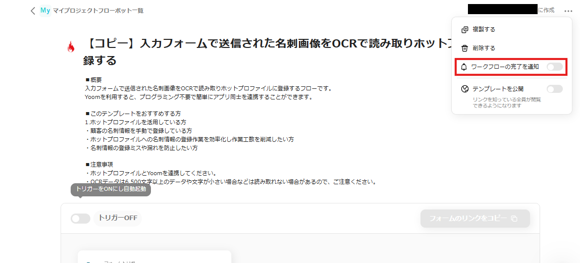この機能はフローボット作成ページの右上3点リーダより「ワークフローの完了を通知」をONにすることで設定できます。