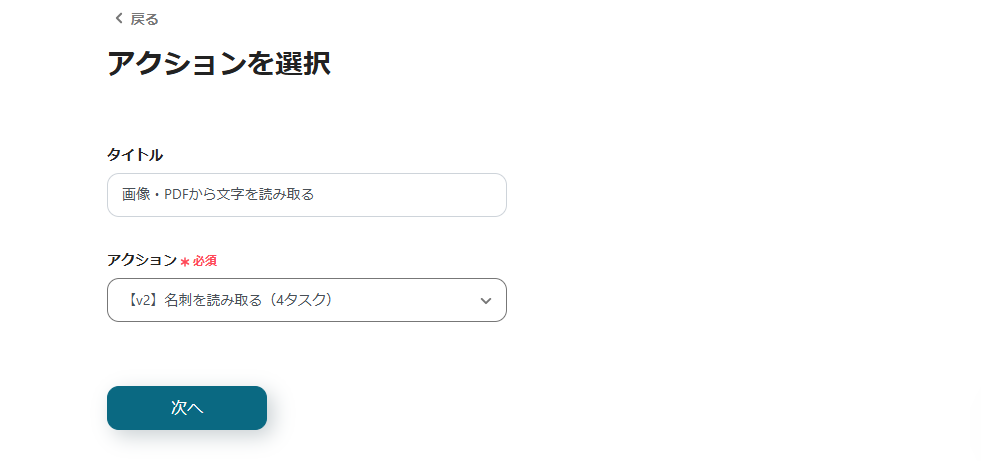 今回は名刺画像を読み取るフローのため、アクションは「名刺を読み取る」を選択してください。
