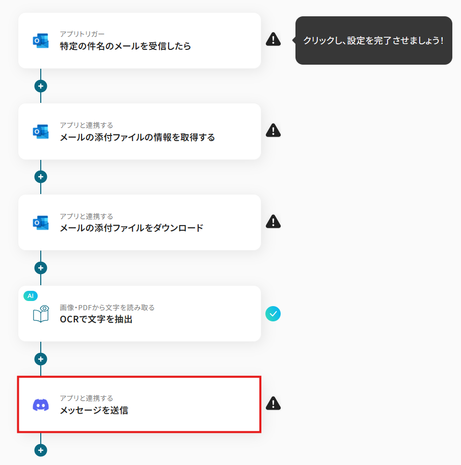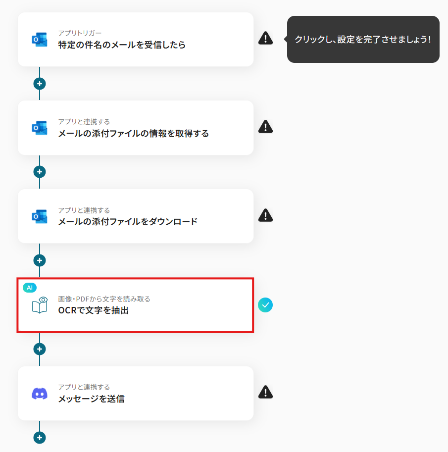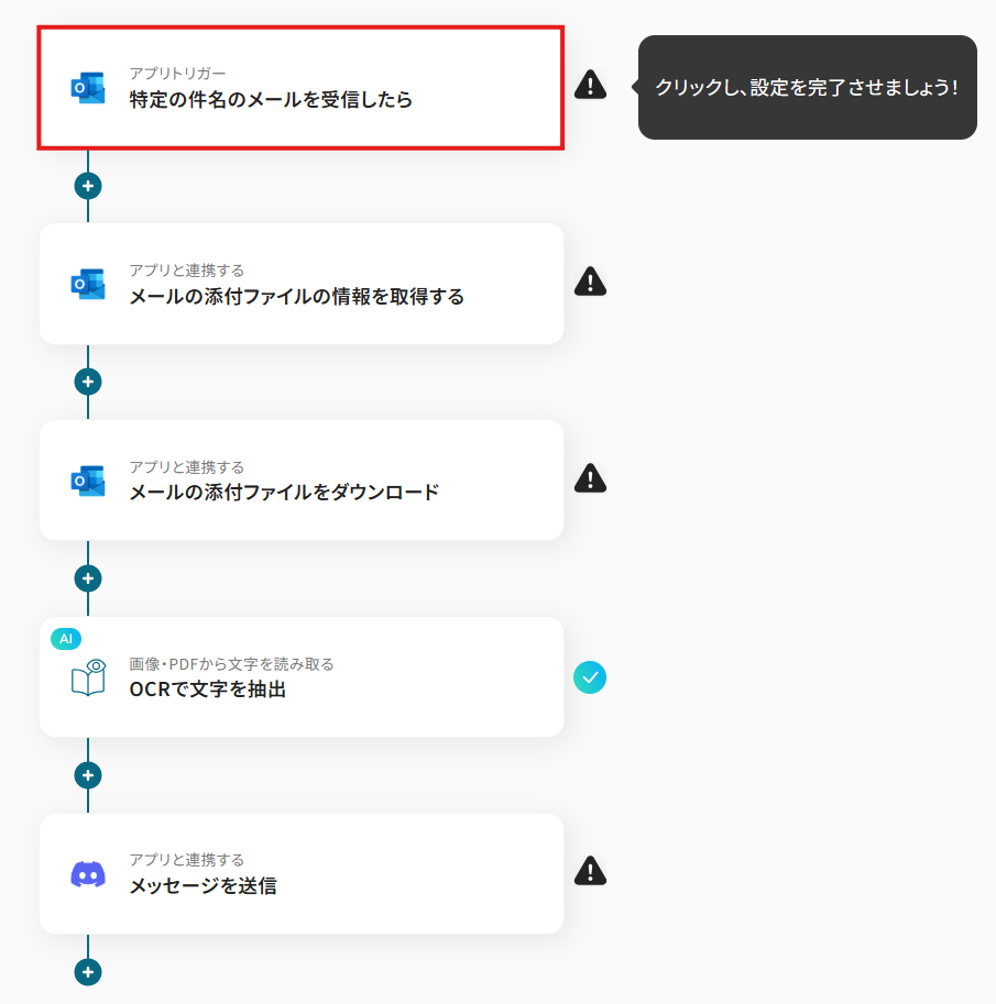 ■概要 取引先からOutlookで受信する請求書や注文書など、日本語PDFの内容確認や転記作業に手間を感じていませんか。 目視での確認や手作業での入力は、時間がかかるだけでなく、入力ミスなどのヒューマンエラーを引き起こす可能性もあります。 このワークフローは、Outlookで特定のメールを受信した際に、添付された日本語PDFファイルを自動でOCR処理し、その結果をDiscordへ通知するため、これらの課題をスムーズに解消できます。 ■このテンプレートをおすすめする方 ・Outlookで受信する日本語PDFのOCR処理を手作業で行い、非効率を感じている方 ・請求書や契約書などのPDFからテキスト情報を抽出し、別アプリに転記している方 ・Discordを業務連絡に活用しており、定型的な情報共有を自動化したいと考えている方 ■注意事項 ・Outlook、DiscordのそれぞれとYoomを連携してください。 ・トリガーは5分、10分、15分、30分、60分の間隔で起動間隔を選択できます。 ・プランによって最短の起動間隔が異なりますので、ご注意ください。 ・Microsoft365(旧Office365)には、家庭向けプランと一般法人向けプラン(Microsoft365 Business)があり、一般法人向けプランに加入していない場合には認証に失敗する可能性があります。 ・OCRまたは音声を文字起こしするAIオペレーションはチームプラン・サクセスプランでのみご利用いただける機能となっております。フリープラン・ミニプランの場合は設定しているフローボットのオペレーションはエラーとなりますので、ご注意ください。 ・チームプランやサクセスプランなどの有料プランは、2週間の無料トライアルを行うことが可能です。無料トライアル中には制限対象のアプリやAI機能(オペレーション)を使用することができます。 ・OCRデータは6,500文字以上のデータや文字が小さい場合などは読み取れない場合があるので、ご注意ください。 ・ダウンロード可能なファイル容量は最大300MBまでです。アプリの仕様によっては300MB未満になる可能性があるので、ご注意ください。 ・トリガー、各オペレーションでの取り扱い可能なファイル容量の詳細は下記をご参照ください。 https://intercom.help/yoom/ja/articles/9413924