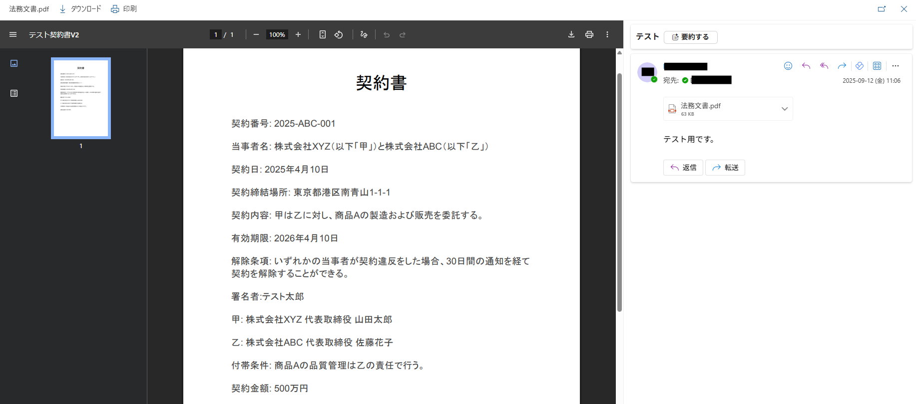今回は下図のようなPDFファイルを送信してみました。 テスト用のため、ファイル内容は架空の情報(「株式会社test」や「テスト太郎」など)でOKです!