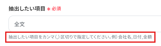 「抽出したい項目」は、データから抽出したい項目を設定します。 ここで抽出したテキストデータを用いてDiscordにデータを通知するため、Discordに通知したい項目を全て設定するようにしましょう。