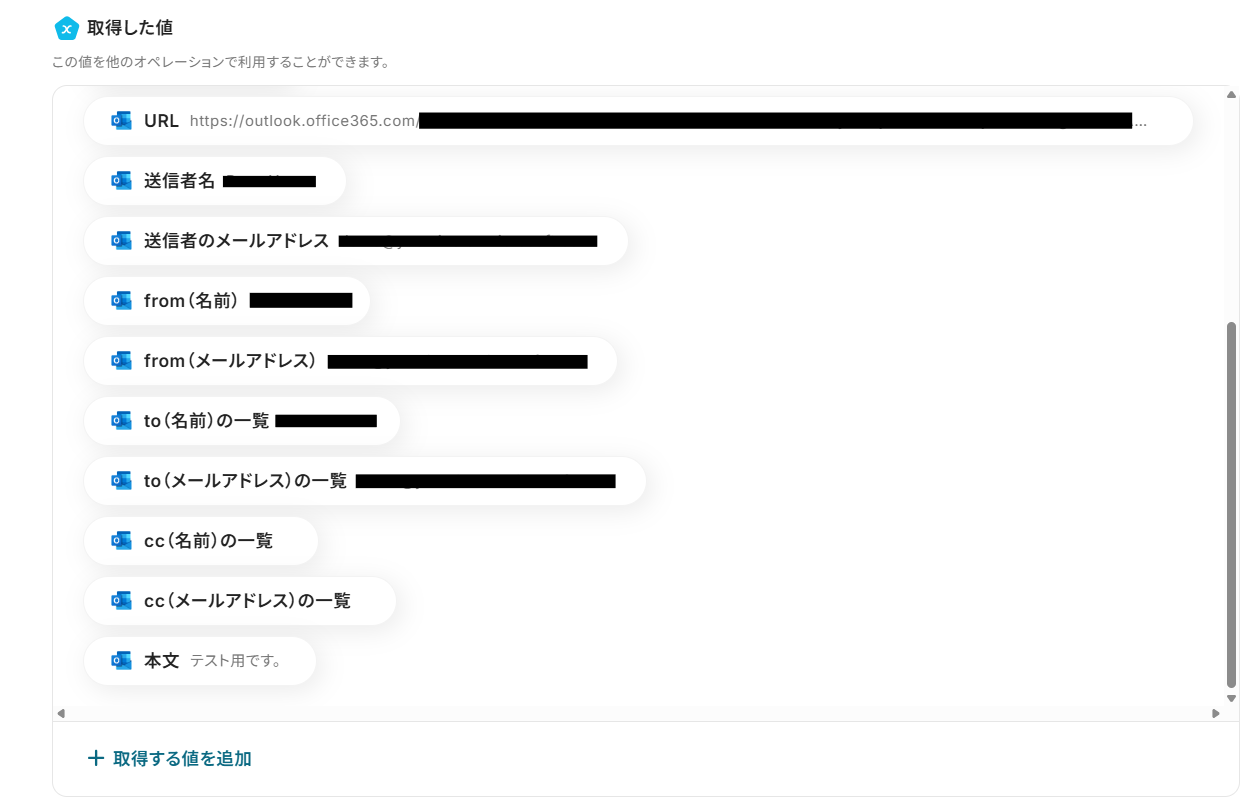 テストが成功すると取得した値 が表示され、Outlookのデータが確認できます。「保存する」をクリックして完了です! 取得した値について、詳しくはこちら をご参照ください。
