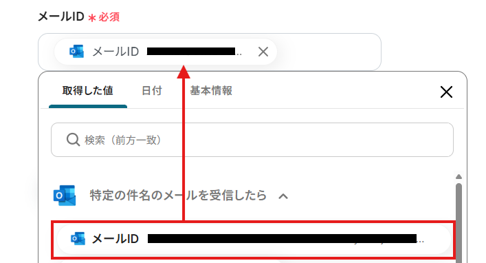 2.API接続設定を行います。 「メールID」は入力欄をクリックして表示される取得した値から選択 してください。 取得した値を活用することで、固定値ではなく、トリガーが実行されるたびに最新の情報が反映できます。