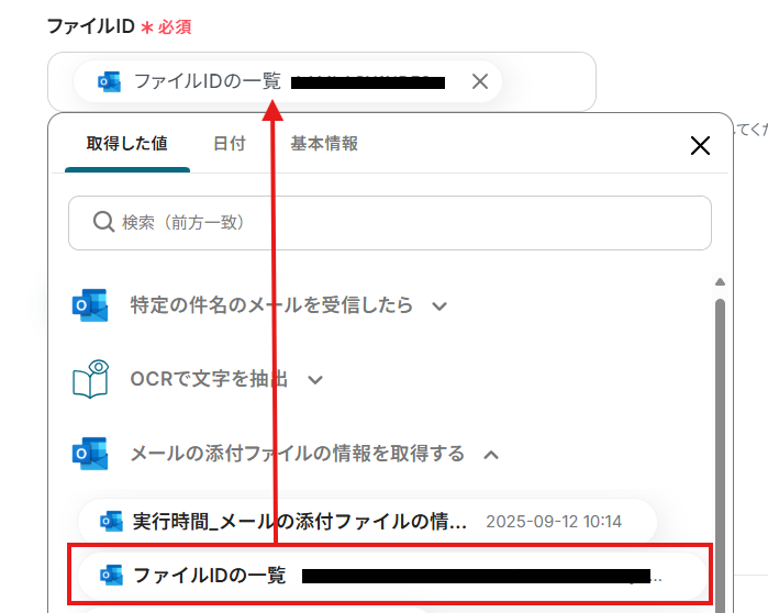 「ファイルの添付方法」は、取得した値をプルダウンから選択してください。