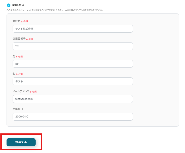 「取得した値」にはテストで使用する回答を入力しておきます。