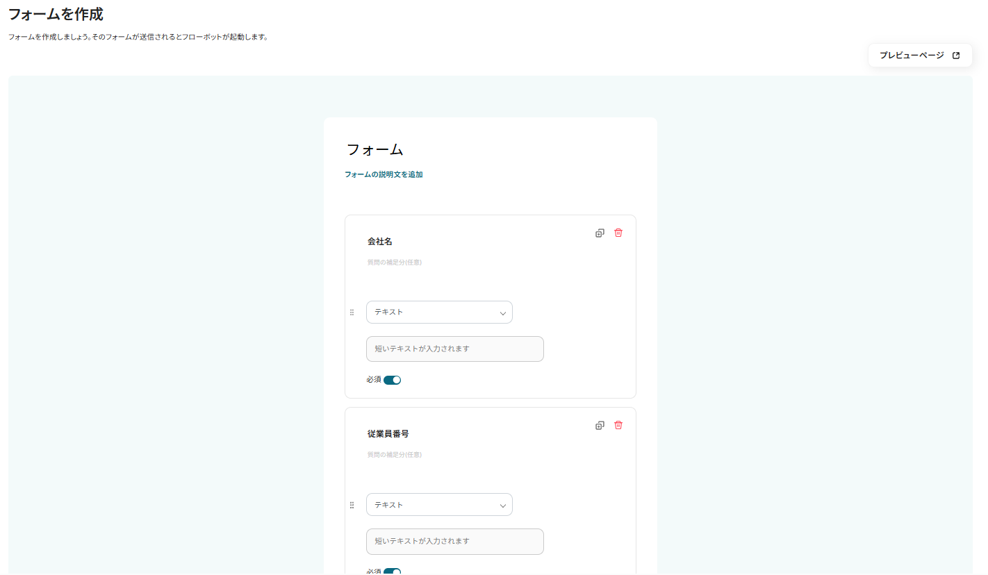 先ほど入力したフォームと完了ページを「プレビューページ」と「完了ページ」で確認できます。