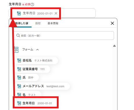 「生年月日」も同様に「取得した値」から入力します。