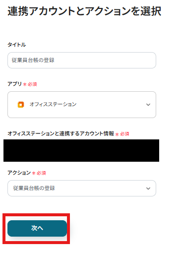 タイトルと連携するアカウント情報を設定し、アクションはテンプレート通りのまま「次へ」をクリックして進んでください。
