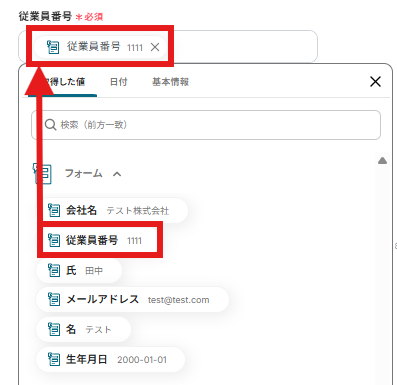 「従業員番号」を「取得した値」から入力します。