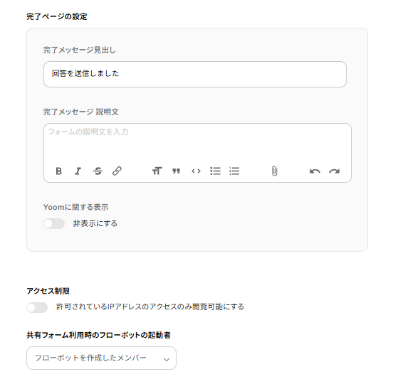 「完了ページの設定」や「アクセス制限」や「共有フォーム利用時のフローボットの起動者」なども設定可能です。