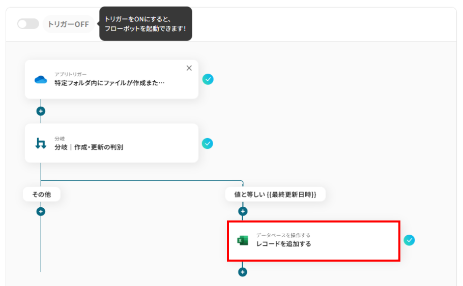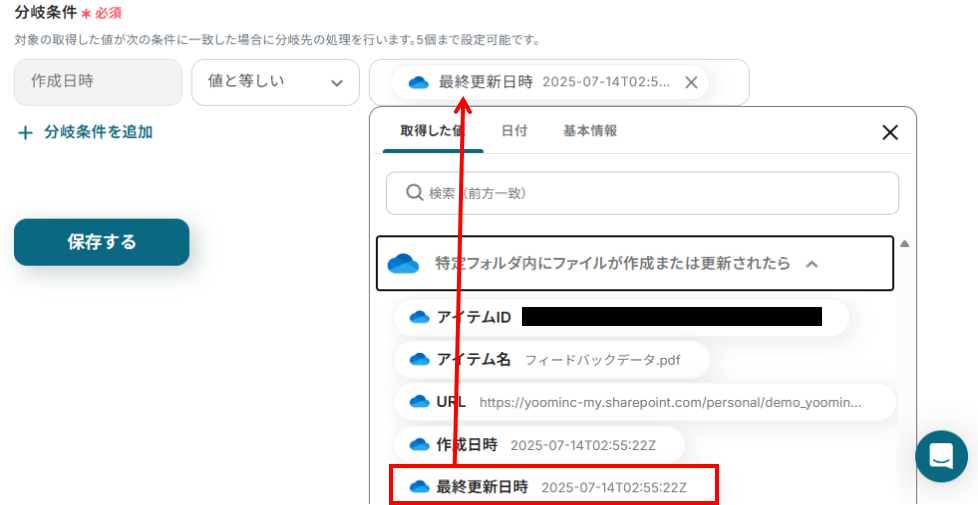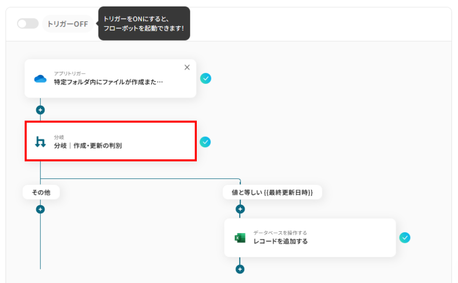 次に、OneDriveに保存したファイルの作成・更新の判別をする分岐設定を行います。まずは、下記赤枠を選択してください。