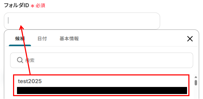 - フォルダID:こちらも入力欄をクリックして先ほどファイルを保存したフォルダを選択しましょう。