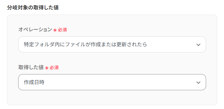 下記の「取得した値」にはデフォルトで作成日時が入力されています。今回はOneDriveの作成日時を元に分岐設定したいので、このままで大丈夫です。