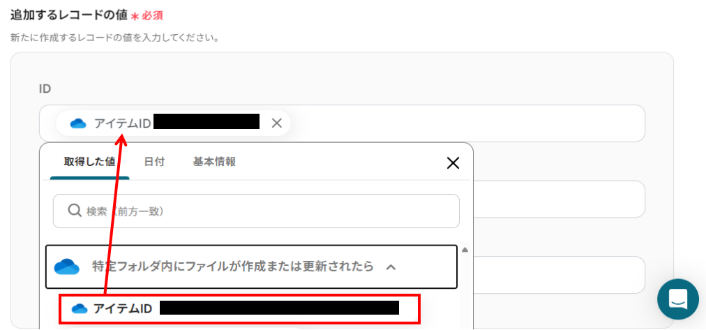 「追加するレコードの値」の、それぞれの項目欄をクリックすると下記のようなアウトプットが表示されます。お好みに合わせてそれぞれの項目を入力してください。