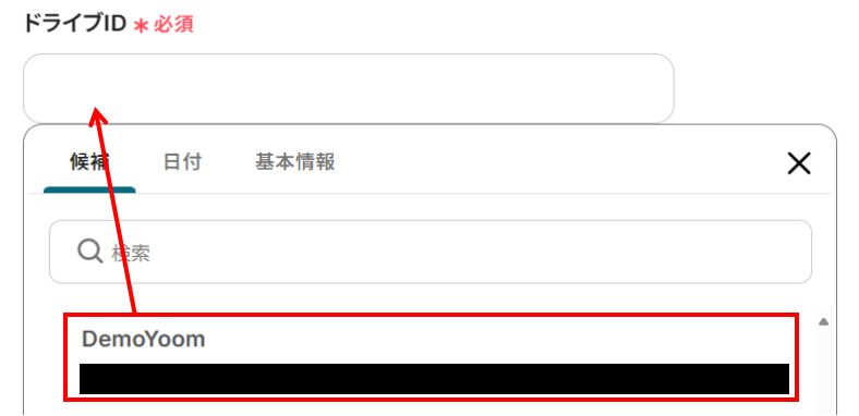 - ドライブID:入力欄をクリックすると下記のように候補が表示されます。対象のドライブIDを選択してください。