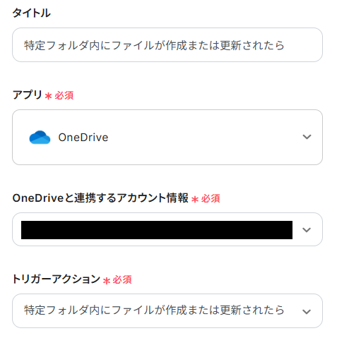 アクションは、テンプレート通りに「特定フォルダ内にファイルが作成または更新されたら」のままで大丈夫です。