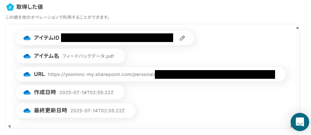 設定が完了したら、「テスト」を実行してみましょう。テストが成功すると、下記のようなアウトプットが表示されます。先ほどOneDriveに保存したファイル情報が反映していればOKです!